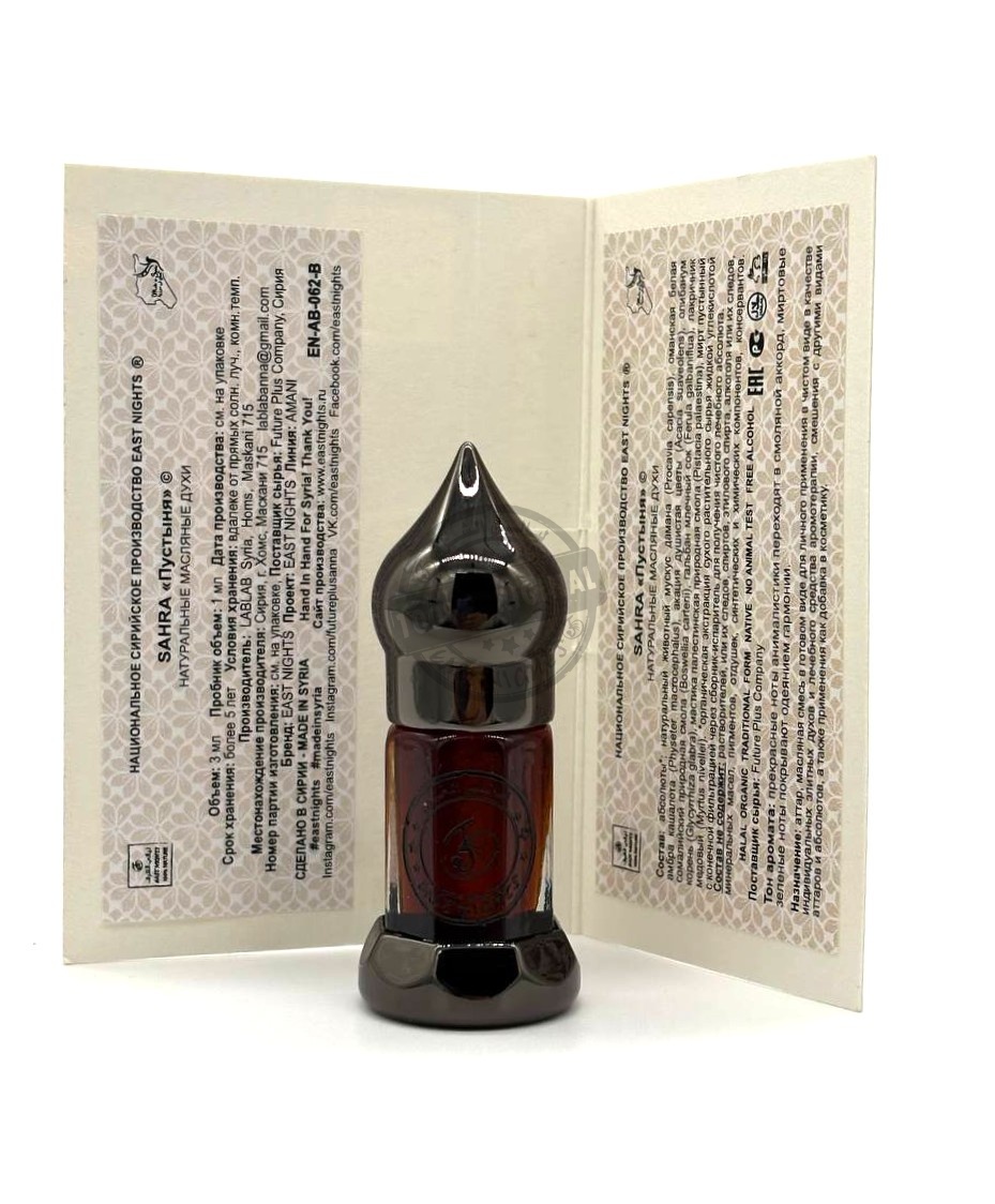 Состав: абсолюты: натуральный животный мускус дамана, оманская белая амбра кашалота, акация душистая цветы, олибанум сомалийский природная смола, гальман млечный сок, лакричник корень, мастика палестинская природная смола, мирт пустынный медовый.